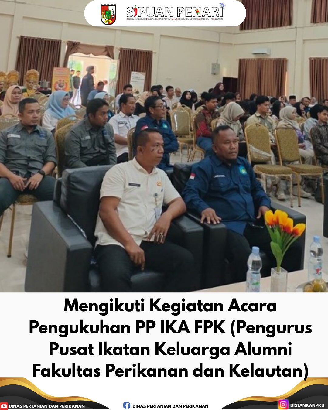 Pada hari Rabu, 18 Juni 2025, Dinas Pertanian dan Perikanan Kota Pekanbaru, yang diwakili oleh Kepala Bidang Perikanan, Bapak Ismail, S.Pi, turut hadir dalam acara Pengukuhan Pengurus Pusat Ikatan Keluarga Alumni Fakultas Perikanan dan Kelautan (PP IKA FPK) Universitas Riau, yang diselenggarakan di Gedung Senangin, Fakultas Perikanan dan Kelautan, Universitas Riau.