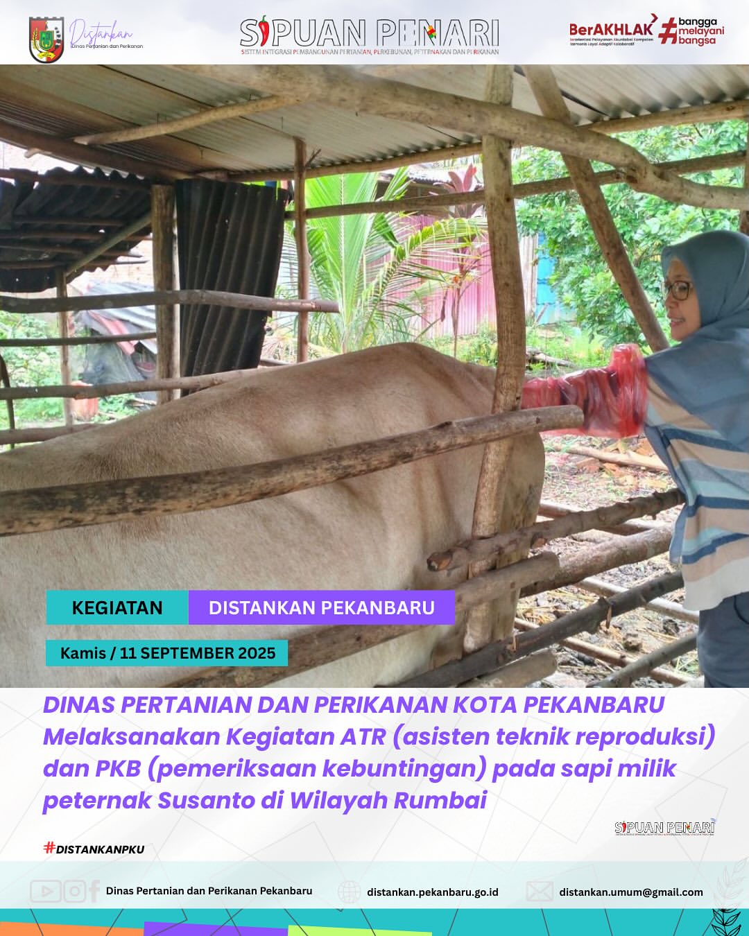 Hari Kamis, 09 September 2025 Bidang Peternakan dan Kesehatan Hewan Dinas Pertanian dan Perikanan Kota Pekanbaru melaksanakan kegiatan Asistensi Teknik Reproduksi (ATR) sekaligus Pemeriksaan Kebuntingan (PKB) pada sapi milik Bapak Susanto, salah satu peternak di wilayah Rumbai. 🐄