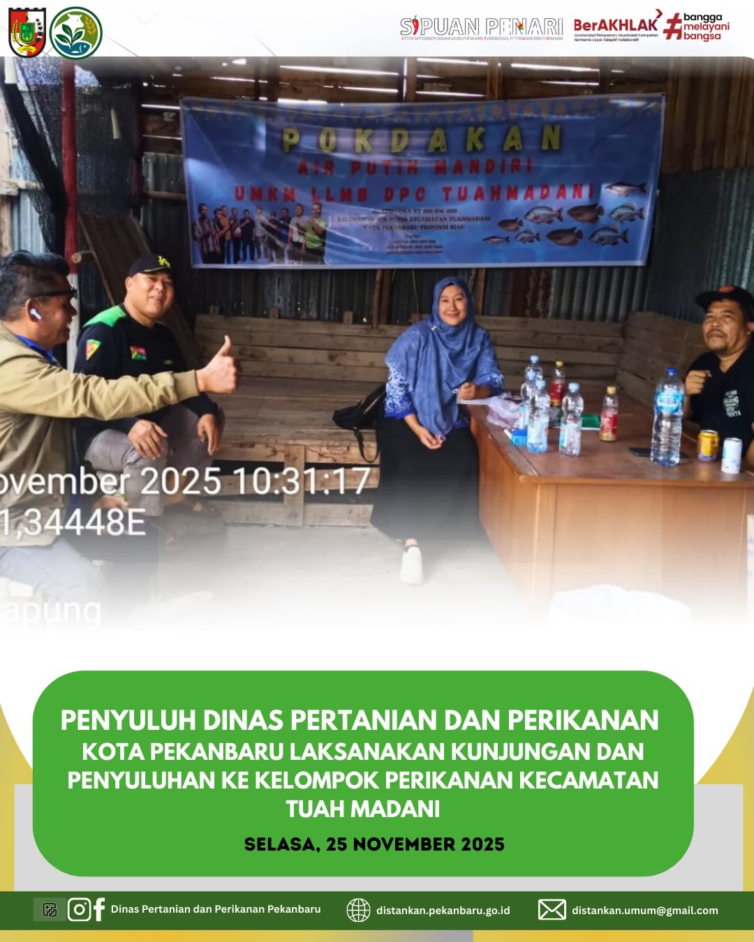 Pada Selasa, 25 November 2025, penyuluh Dinas Pertanian dan Perikanan Kota Pekanbaru melakukan kunjungan dan penyuluhan di POKDAKAN Air Putih Mandiri, Jl. TPU-UKA, Kelurahan Air Putih. Kegiatan ini difokuskan pada budidaya ikan Gurami dan Patin, dimana ikan Patin merupakan bantuan benih dan pakan dari Dinas Pertanian dan Perikanan Kota Pekanbaru yang disalurkan akhir Oktober lalu.