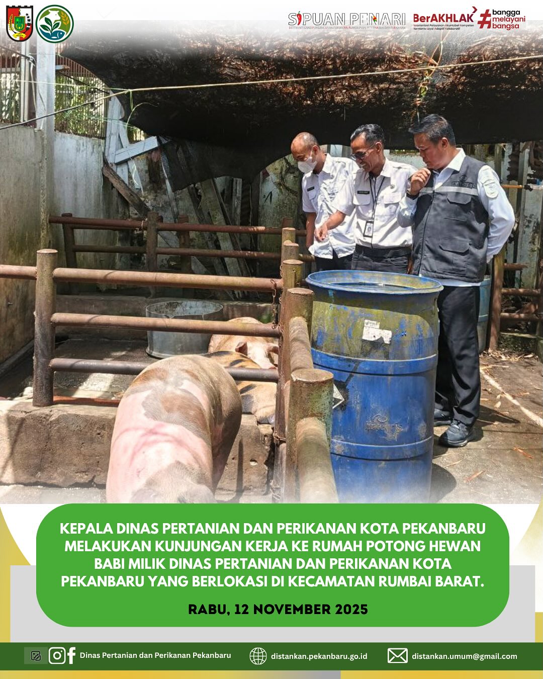 Kepala Dinas Pertanian dan Perikanan Kota Pekanbaru bersama tim melaksanakan kunjungan kerja ke Rumah Potong Hewan (RPH) Babi milik Dinas Pertanian dan Perikanan Kota Pekanbaru yang berlokasi di Kecamatan Rumbai Barat, pada Rabu, 12 November 2025.