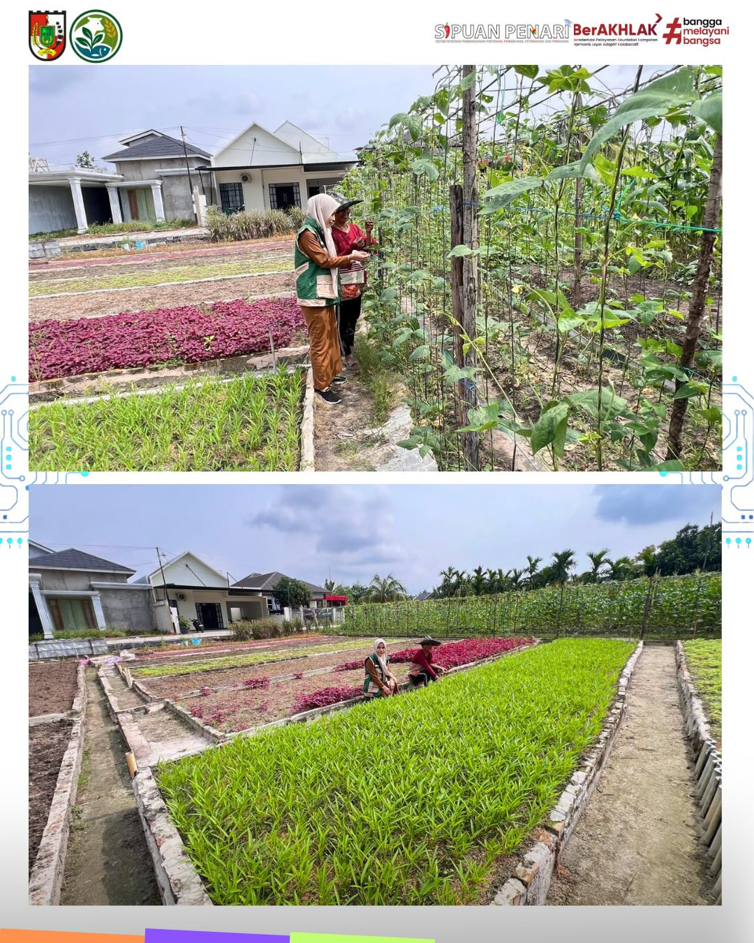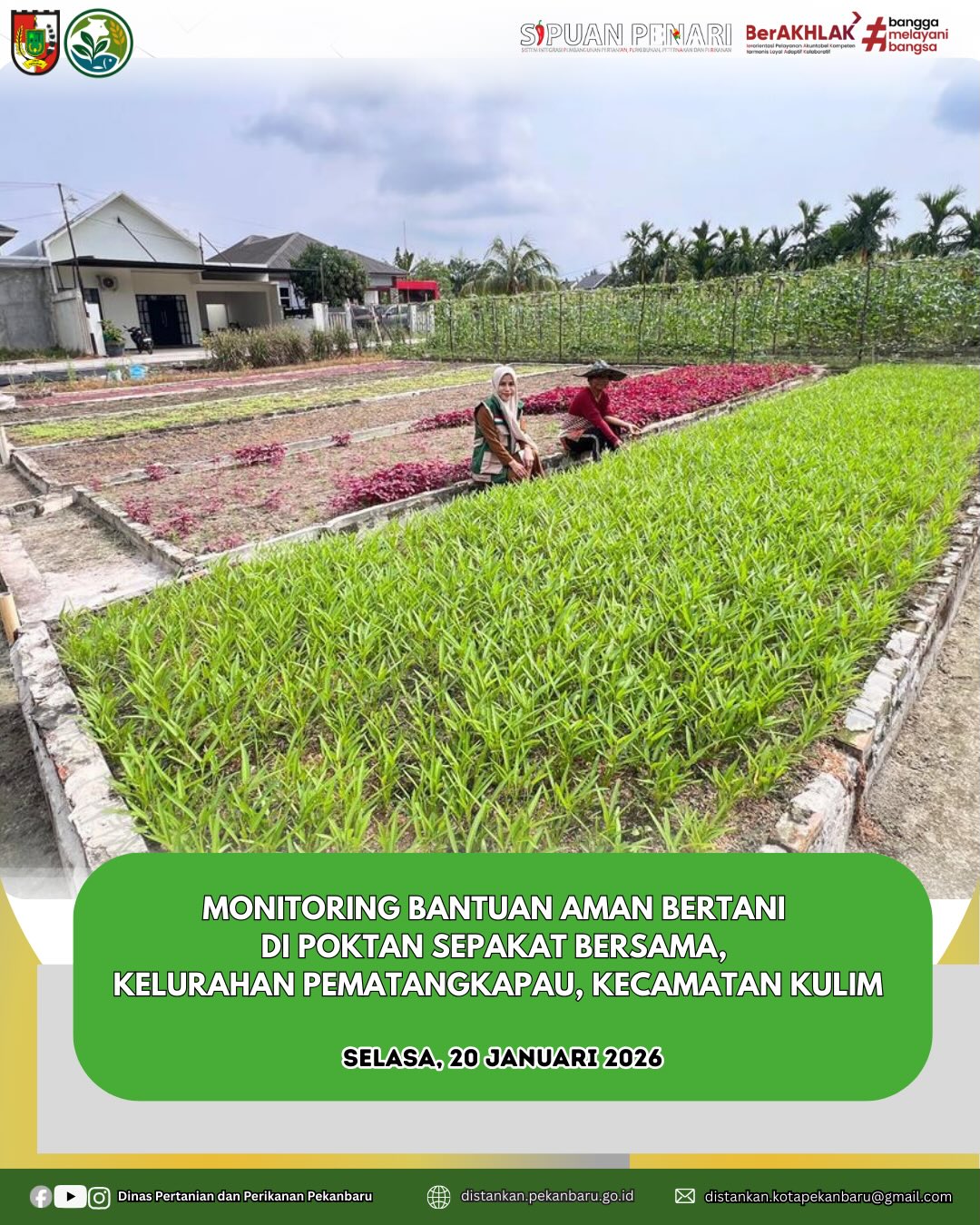 Penyuluh Dinas Pertanian dan Perikanan Kota Pekanbaru melaksanakan monitoring bantuan AMAN BERTANI komoditas sayuran hortikultura di Kelompok Tani Sepakat Bersama, Kelurahan Pematangkapau, Kecamatan Kulim. Bantuan yang diberikan telah ditanam oleh petani dan sangat bermanfaat dalam mendukung kegiatan pertanian di Kota Pekanbaru.