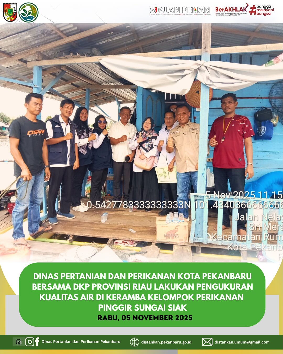Rabu, 5 November 2025, Dinas Pertanian dan Perikanan Kota Pekanbaru bersama DKP Provinsi Riau melakukan pengukuran kualitas air di keramba milik Pokdakan Mina Baung Sri Meranti, Jalan Nelayan, Kelurahan Sri Meranti.