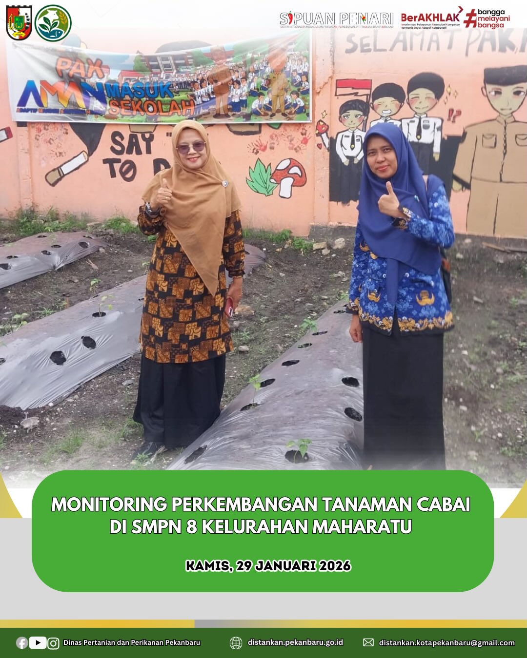 Kegiatan monitoring dilakukan pada kebun demplot tanaman cabai di SMPN 8 Kelurahan Maharatu sebagai bagian dari pembelajaran dan edukasi pertanian sejak dini.