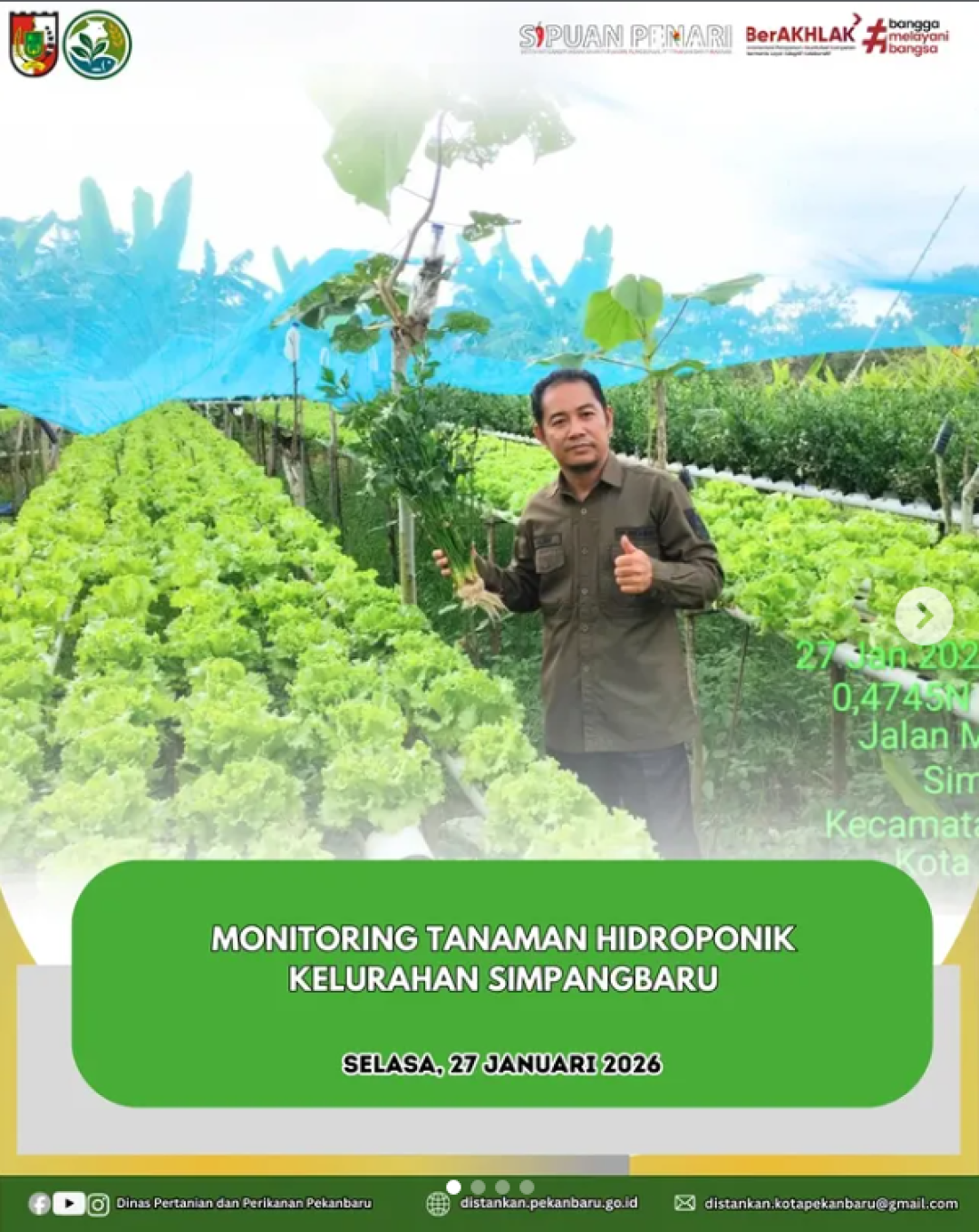 Dinas Pertanian dan Perikanan Kota Pekanbaru melalui BPP Tampan melaksanakan kegiatan monitoring tanaman hidroponik non-kelompok milik Pak Heri yang berlokasi di Jl. Merak Sakti Ujung, Kelurahan Simpangbaru, Kecamatan Bina Widya.