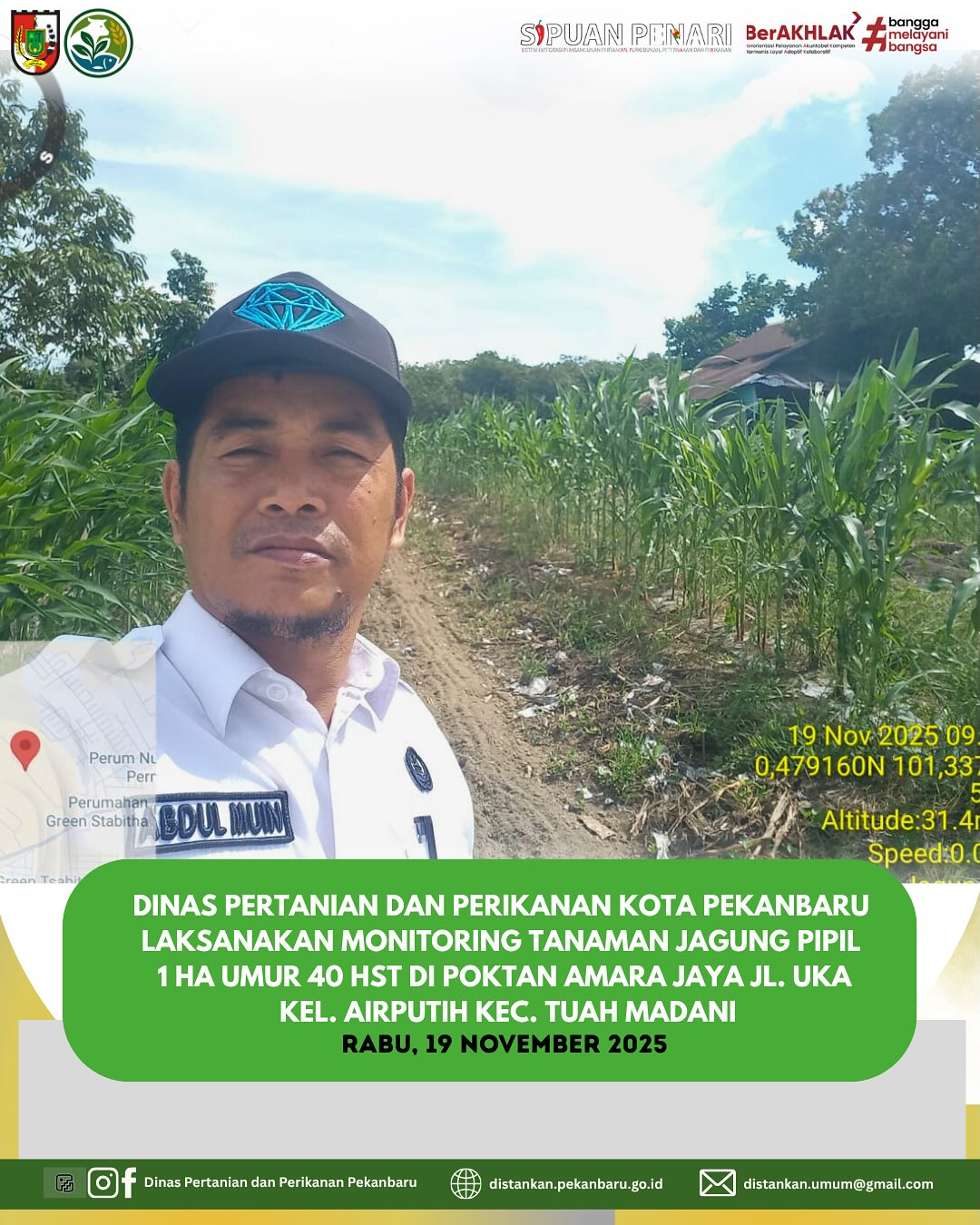 Dinas Pertanian dan Perikanan Kota Pekanbaru melakukan monitoring perkembangan tanaman jagung pipil seluas 1 hektare berumur 40 HST di Kelompok Tani Amara Jaya, Jl. Uka, Kelurahan Air Putih, Kecamatan Tuah Madani.