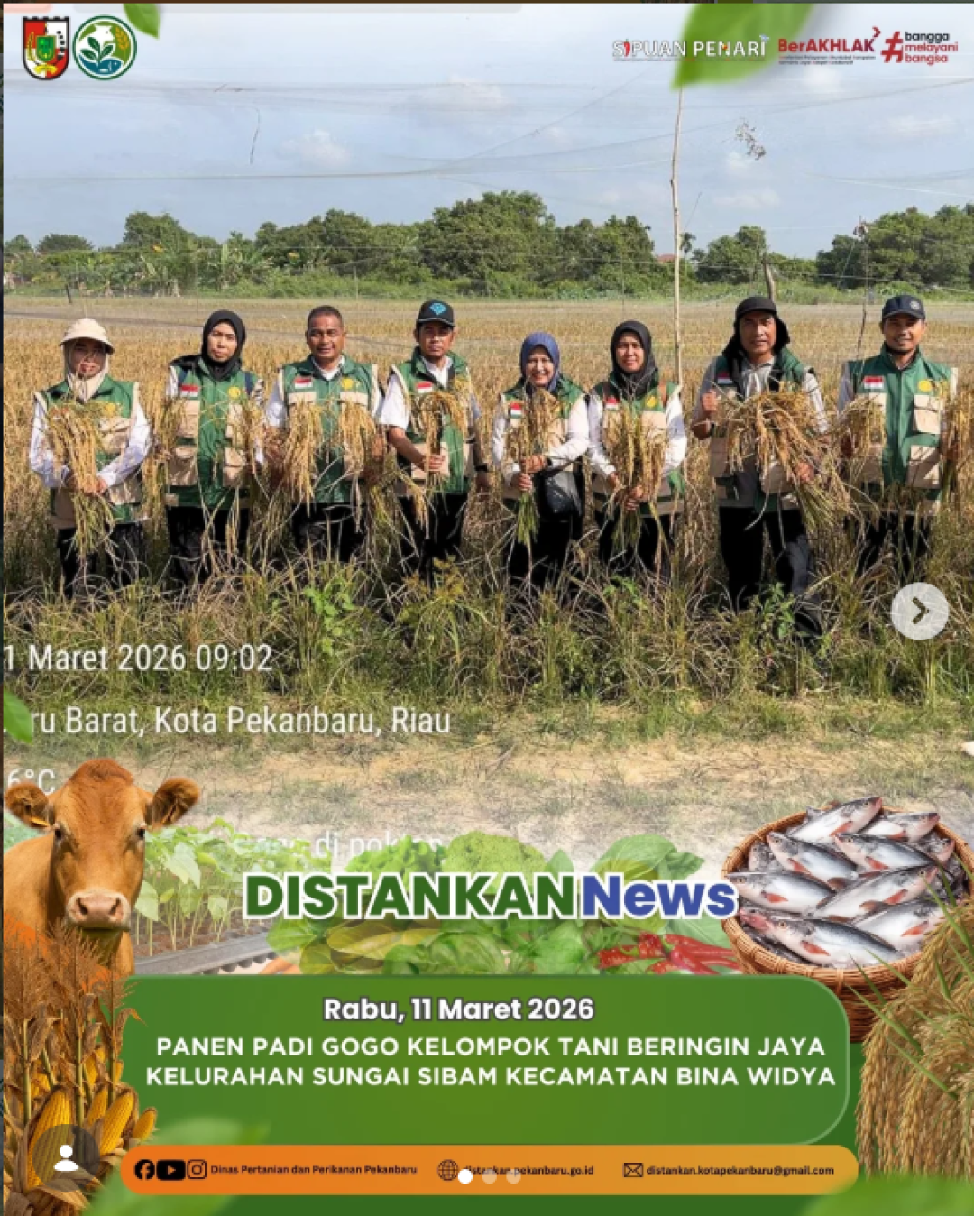 Anggota Kelompok Tani Beringin Jaya di Kelurahan Sungai Sibam, Kecamatan Bina Widya melaksanakan kegiatan panen padi gogo pada lahan seluas 1 hektar. Pertanaman padi gogo ini telah dimulai sejak Desember 2025 dan menjadi salah satu upaya peningkatan produksi pangan di wilayah tersebut.