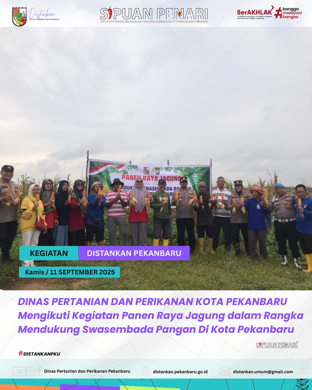 Dinas Pertanian dan Perikanan Kota Pekanbaru kembali melaksanakan Panen Raya Jagung pipil tahap kedua bersama Kelompok Tani Agro Mandiri Sejahtera, yang berlokasi di Kecamatan Kulim.