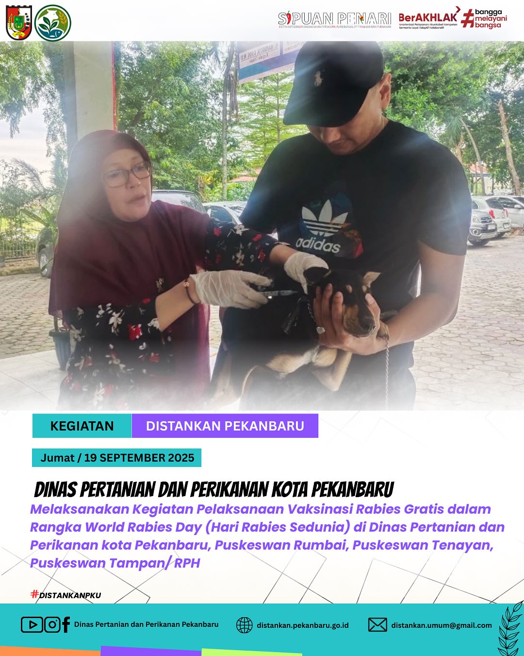 Dalam rangka memperingati World Rabies Day (Hari Rabies Sedunia), Dinas Pertanian dan Perikanan Kota Pekanbaru menggelar Vaksinasi Rabies Gratis untuk HPR (Hewan Penular Rabies) seperti anjing, kucing, dan kera.