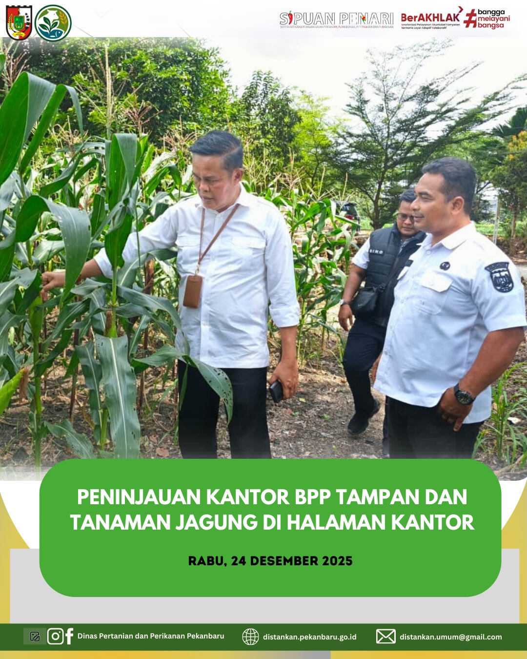 Kepala Dinas Pertanian dan Perikanan Kota Pekanbaru melaksanakan peninjauan ke Kantor Balai Penyuluhan Pertanian (BPP) Tampan yang berlokasi di Jalan Cipta Karya. Peninjauan ini dilakukan untuk melihat langsung kondisi kantor serta perkembangan tanaman jagung yang ditanam di halaman kantor BPP Tampan.