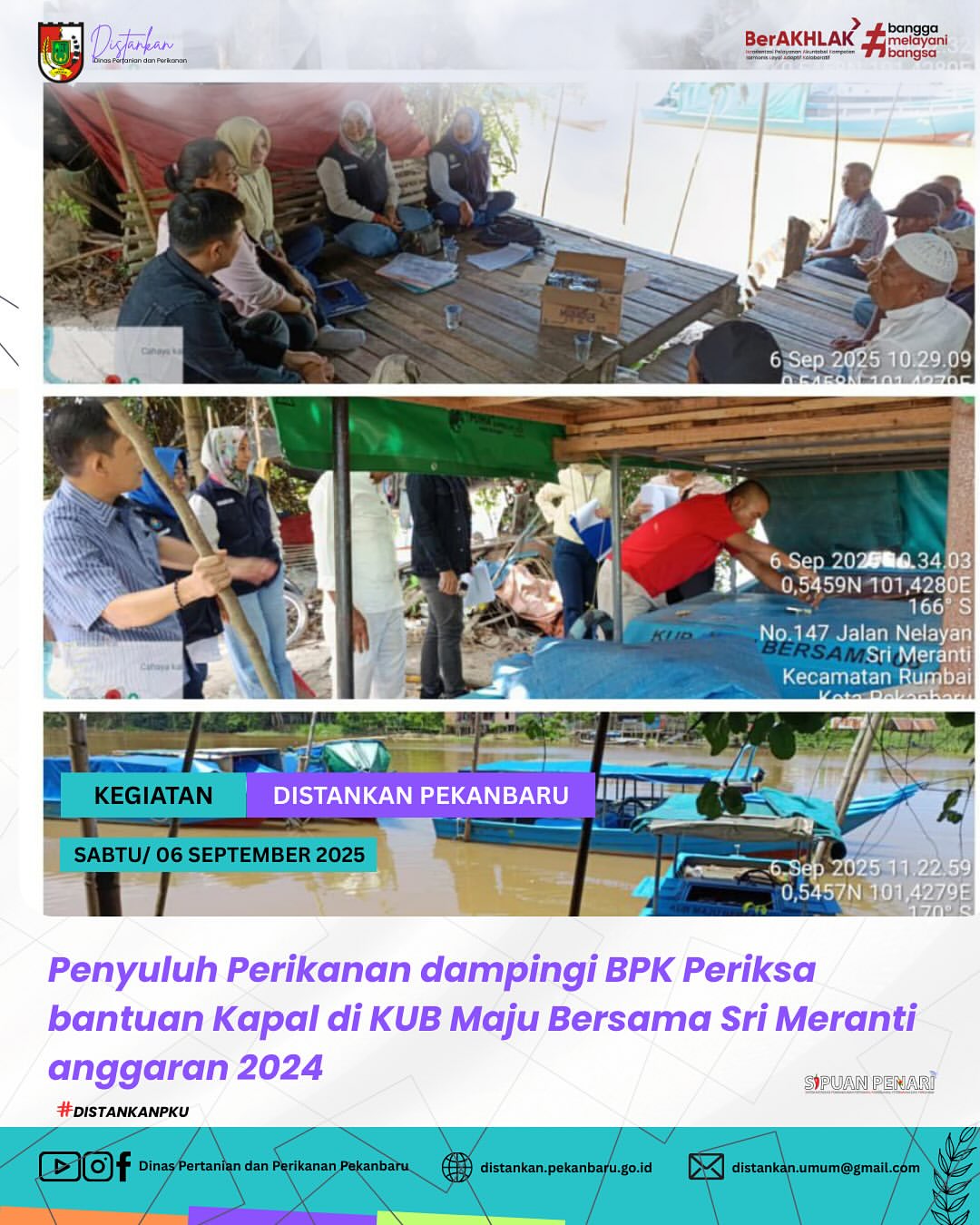 Penyuluh Perikanan Dinas Pertanian dan Perikanan Kota Pekanbaru, Ibu Yenni Emita dan Ibu Rolly Susanti mendampingi Badan Pemeriksa Keuangan (BPK) dalam kegiatan pemeriksaan fisik bantuan 10 unit kapal lengkap dengan 20 life jacket yang telah disalurkan kepada Kelompok Usaha Bersama (KUB) Maju Bersama Sri Meranti pada tahun 2024.
