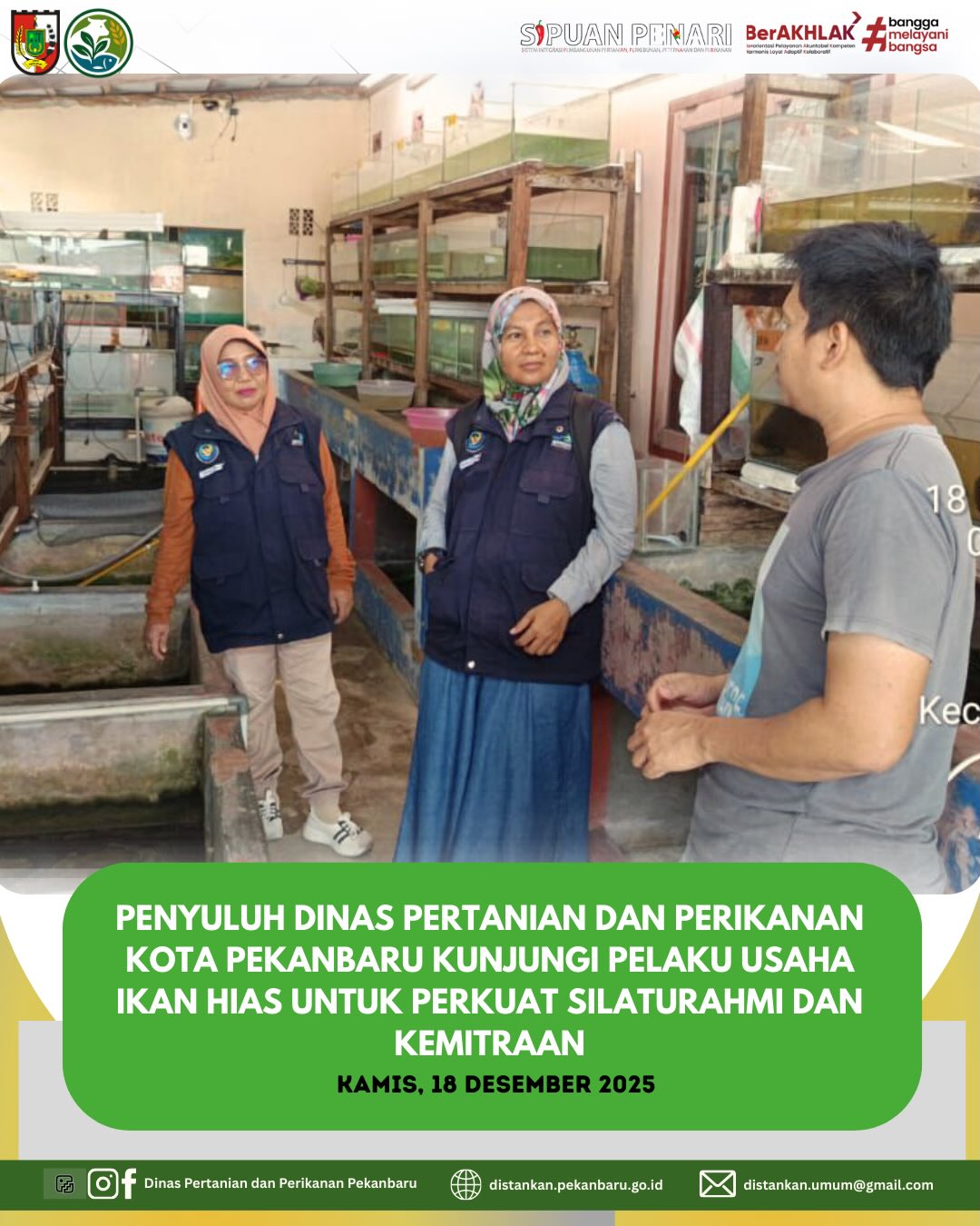 Penyuluh Dinas Pertanian dan Perikanan Kota Pekanbaru melaksanakan kunjungan anjangsana ke usaha budidaya ikan hias milik Bapak Riki Ardianyah Lubis, Ketua Pokdakan Hias Jaya, di Simpang Tiga, Kamis (18/12/2025).