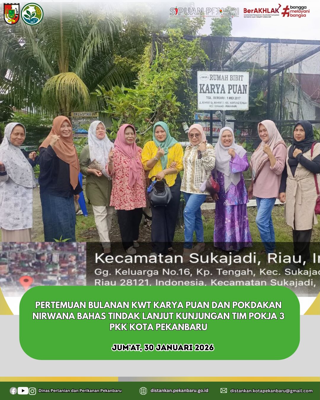 Telah dilaksanakan pertemuan bulanan yang dirangkaikan dengan rapat tindak lanjut kunjungan Tim Pokja 3 PKK Kota Pekanbaru ke Kelompok Wanita Tani (KWT) Karya Puan, Kelurahan Kampung Tengah.