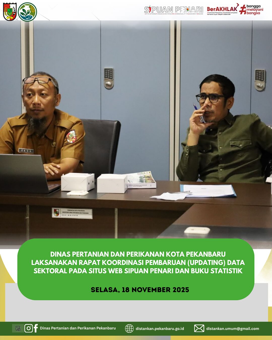 Melalui rapat koordinasi hari ini, Distankan resmi melakukan updating data sektoral pada Sistem Integrasi Pembangunan Pertanian, Perkebunan, Peternakan dan Perikanan — SIPUAN PENARI, sekaligus menyusun Buku Statistik Distankan Kota Pekanbaru edisi terbaru.