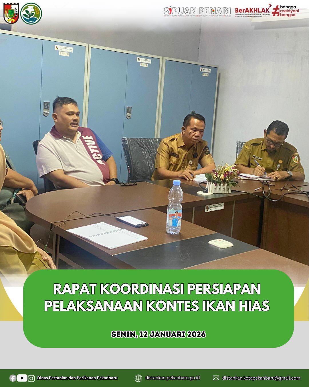 Telah dilaksanakan rapat koordinasi bidang perikanan bersama penyuluh perikanan dan Persatuan Ikan Hias Riau dalam rangka persiapan Kontes Ikan Hias yang direncanakan bersempena dengan HUT Kota Pekanbaru ke-242 Tahun.