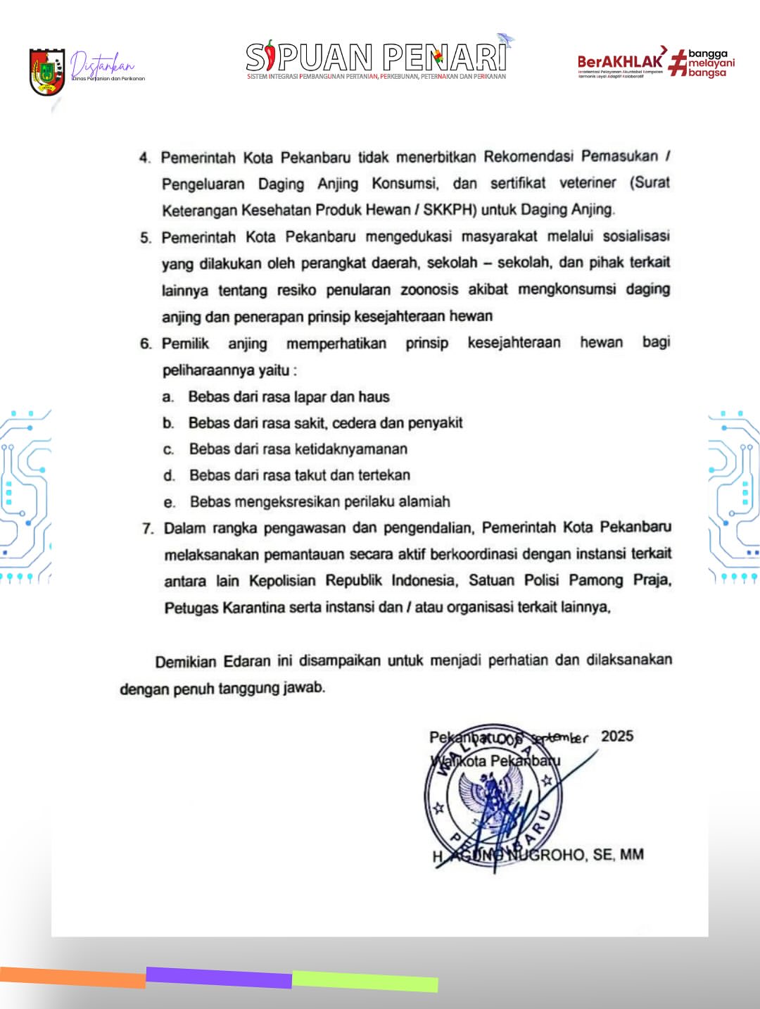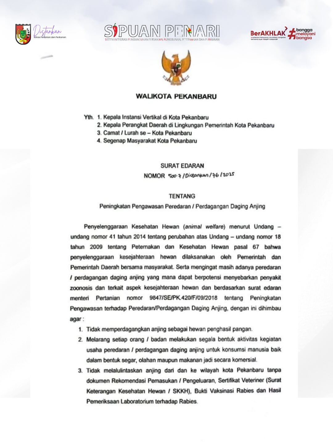 SURAT EDARAN WALIKOTA PEKANBARU TENTANG PENINGKATAN PENGAWASAN PEREDARAN / PERDAGANGAN DAGING ANJING
