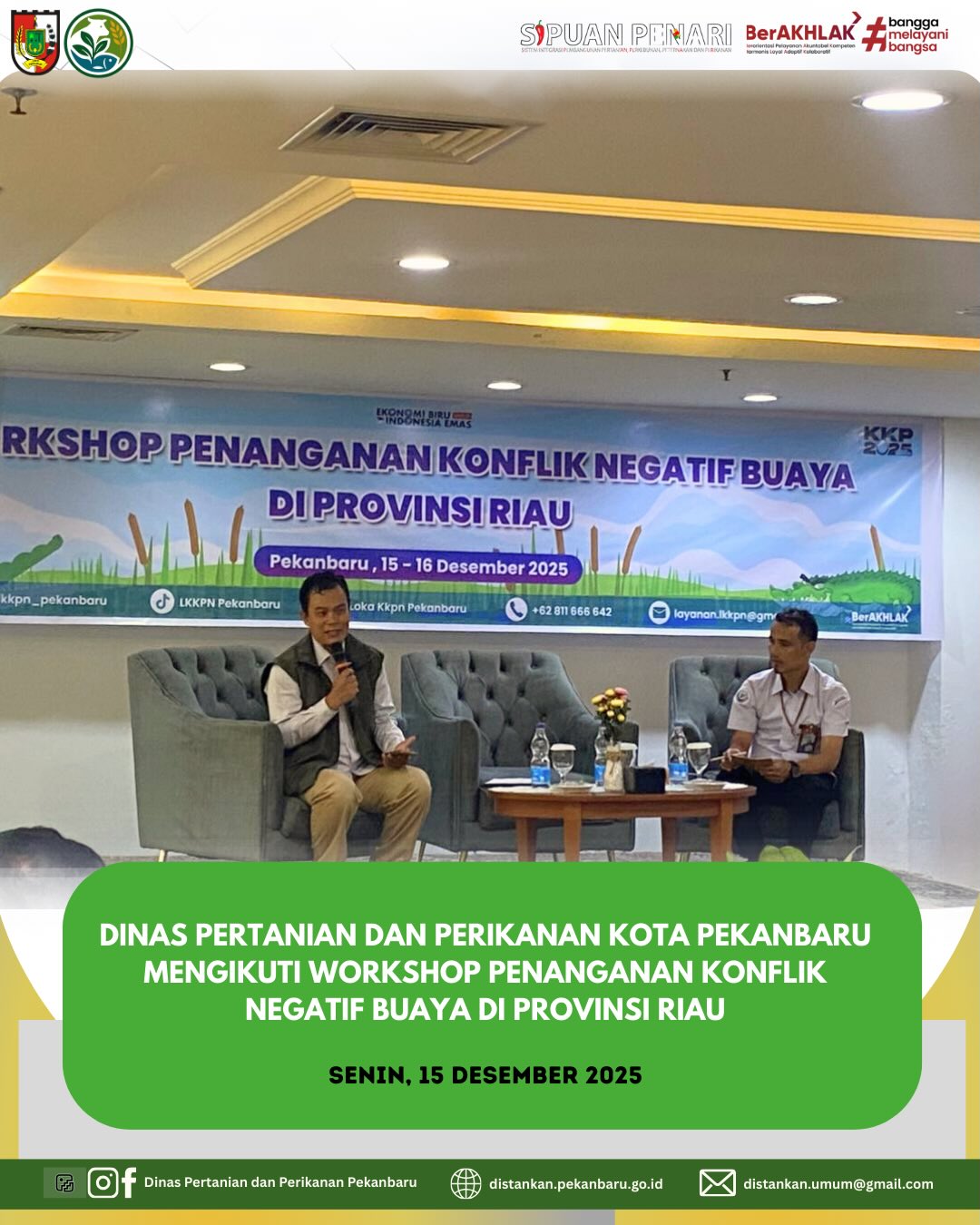 Dinas Pertanian dan Perikanan Kota Pekanbaru mengikuti Workshop Penanganan Konflik Negatif Buaya di Provinsi Riau yang dilaksanakan di Grand Suka Hotel. Kegiatan ini bertujuan untuk meningkatkan pemahaman, koordinasi, dan sinergi lintas sektor dalam menangani konflik antara manusia dan buaya yang semakin meningkat di wilayah perairan Riau.